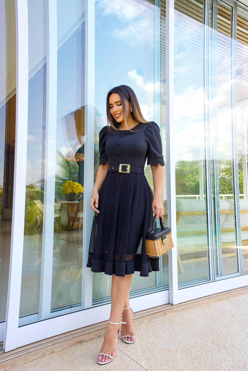 Descubra a sofisticação deste vestido que combina o tradicional com o contemporâneo. Com uma golinha cortada a laser, mangas bufantes e um cinto encapado com fivela dourada em metal, este vestido é uma peça de destaque em seu guarda-roupa. Sua saia em tule, com forro justo por baixo, proporciona um movimento encantador, enquanto o tecido crepe de malha garante conforto incomparável. Este vestido é perfeito para ocasiões especiais, eventos sociais e muito mais. Adicione um toque de elegância e sofisticação ao seu estilo!